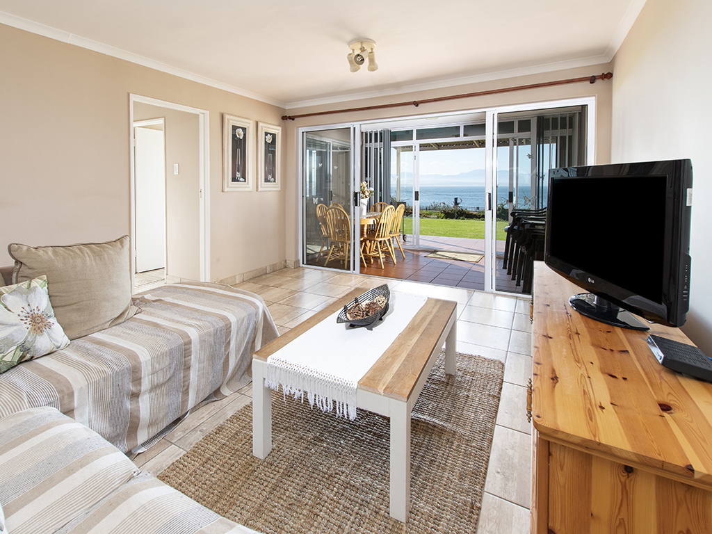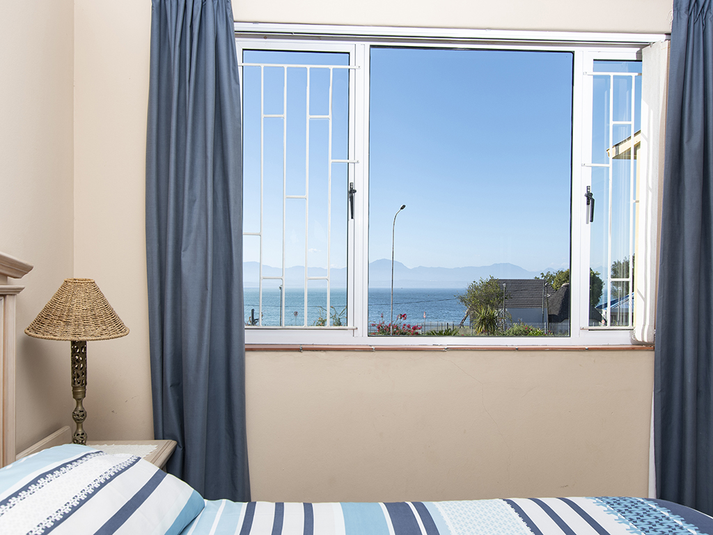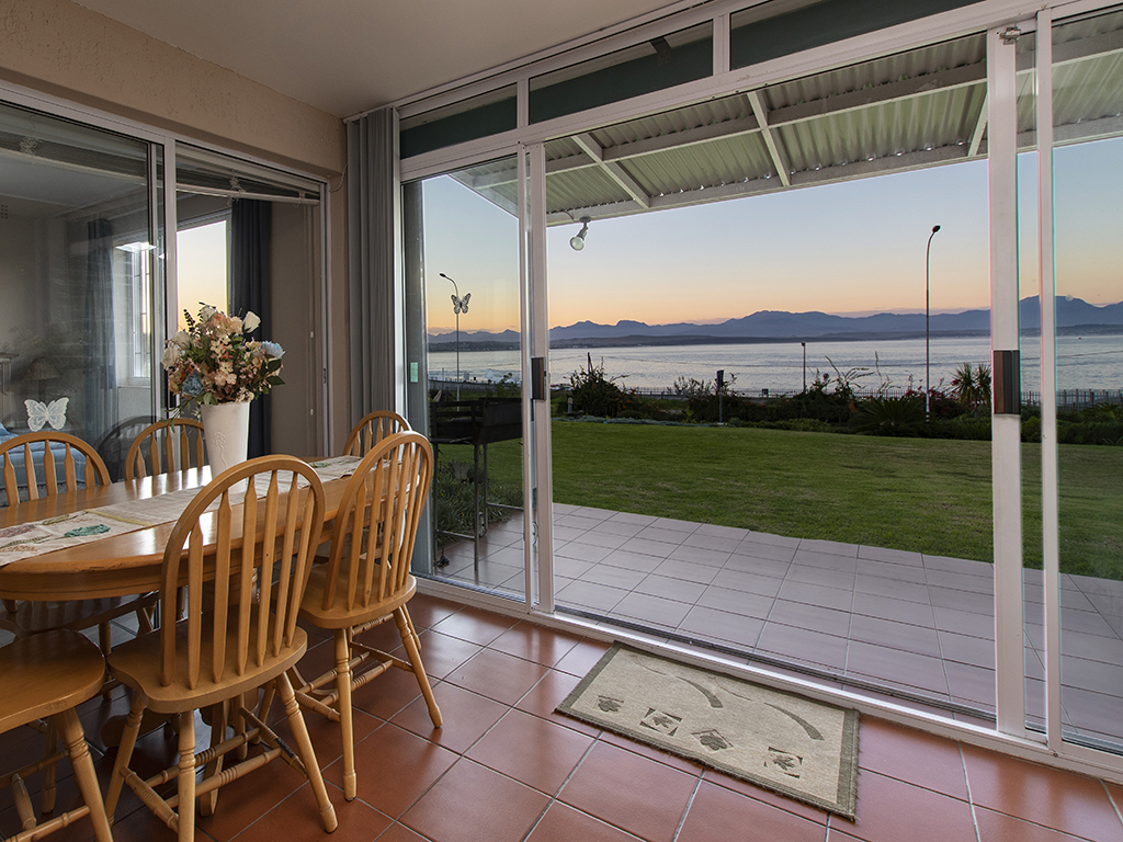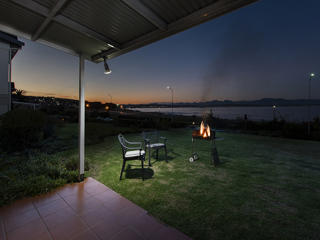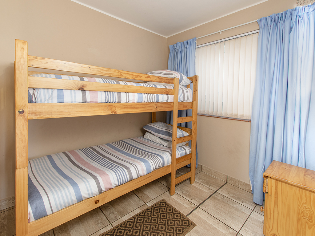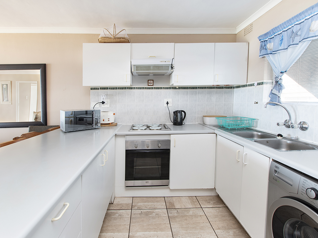 Fully furnished, affordable self-catering holiday accommodation in Mossel Bay, opposite De Bakke beach, 1.4 km from Santos beach and 3.3 km from Diaz beach. Tariff varies according to number of people and time of the year (in season or out of season). The kitchen is fully equipped for self-catering and features stove, oven, fridge-freezer, microwave and a breakfast bar with 5 high chairs. For your convenience, a washing machine is also provided. There are 3 bedrooms. The first bedroom has a double-sized bed. The second bedroom has 2 three-quarter-beds, while the third bedroom has a bunk bed. The apartment is serviced by 2 bathrooms and a guest toilet. One bathroom has a bath while the other bathroom has a shower. The open plan lounge has a flat screen TV fitted with a full selection of DSTV channels. Free Wi-Fi is also provided. The dining area is on the enclosed veranda which leads out to the patio area. This is the ideal place to braai and enjoy the spectacular sea view, while children can have fun on the spacious, beautiful green lawn.